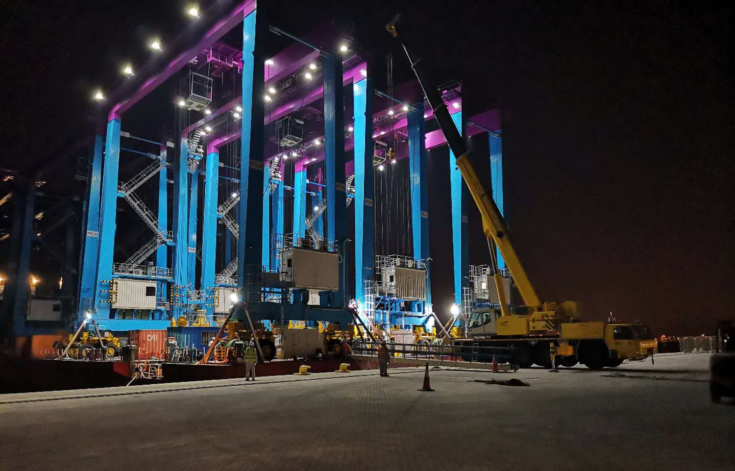 而在7月末發(fā)運的第一批12臺40T輪胎吊經(jīng)過1個月的航行到港后,9月初順利完成卸船,擁入新哈馬德港的懷抱。由于業(yè)主方的高層對該項目高度重視,碼頭方有關人員還在碼頭舉行儀式迎接設備抵港并全程航拍錄像。因項目整體施工策劃得當、安全高效,疫情防控和設備調(diào)試并駕齊驅(qū)兩不誤,“海西重機”再一次贏得了業(yè)主的稱贊。