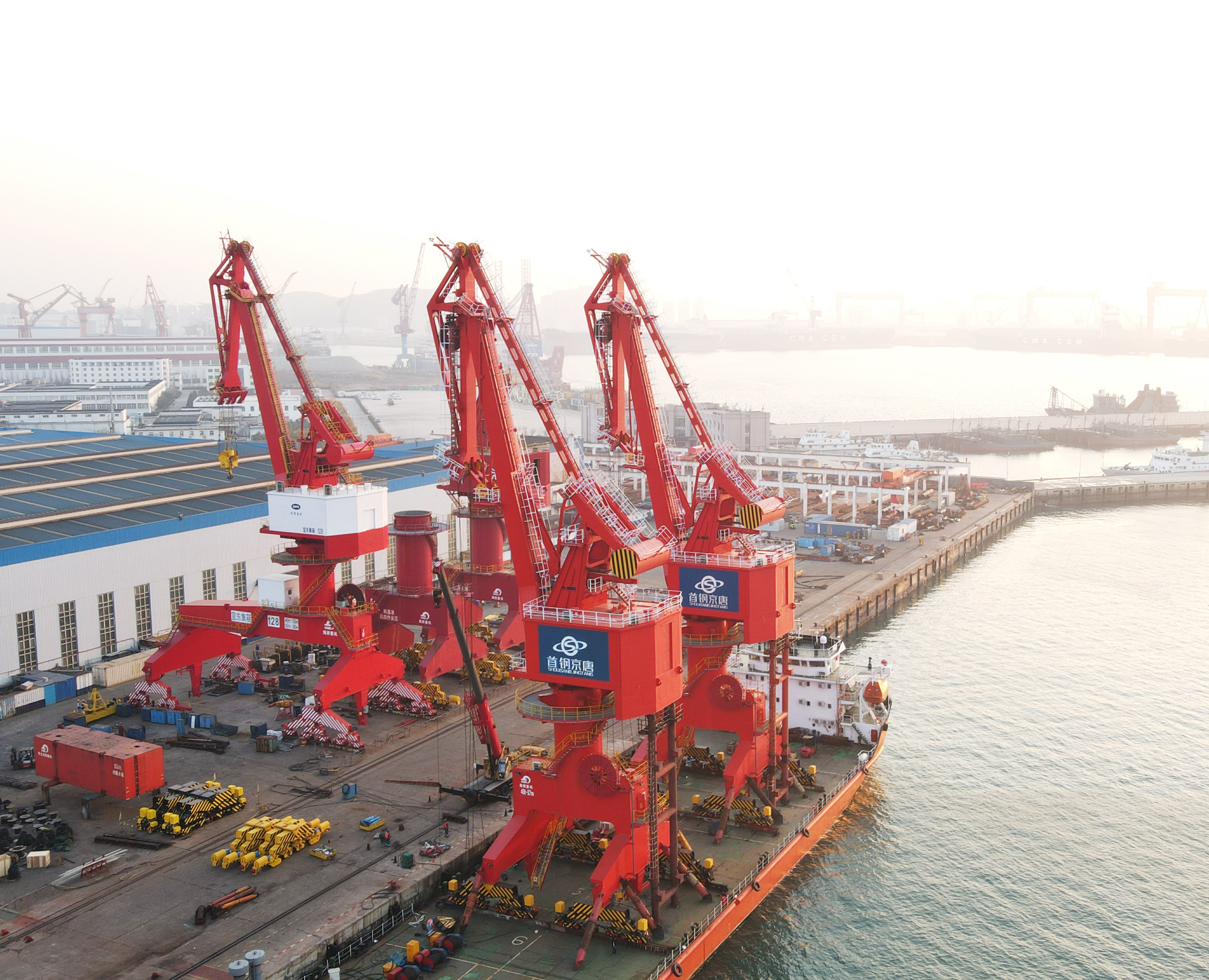 11月24日,中國船舶集團旗下武漢船機海西重機公司為首鋼京唐鋼鐵聯(lián)合有限責任公司打造的2臺MQ40t-37m雙四連桿多用途門座起重機順利發(fā)運。