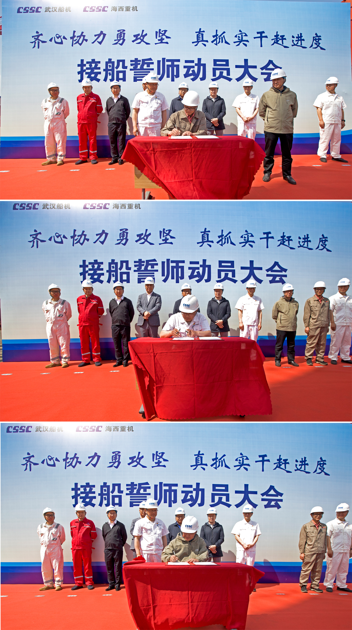 為了明確目標(biāo)、凝聚共識(shí)、齊心協(xié)力、克難攻堅(jiān),亮明迎難而上的堅(jiān)定信心和堅(jiān)強(qiáng)決心,動(dòng)員全員上下持續(xù)營造濃厚干事氛圍,掀起“齊心協(xié)力勇攻堅(jiān),真抓實(shí)干趕進(jìn)度”的高潮,全力以赴打好海工項(xiàng)目集中攻堅(jiān)戰(zhàn),5月25日上午,中國船舶集團(tuán)旗下武漢船機(jī)海西重機(jī)公司在生產(chǎn)現(xiàn)場(chǎng)組織開展接船誓師動(dòng)員大會(huì)。華夏金融租賃有限公司、北京神大集團(tuán)有限公司、飛勵(lì)特船舶管理有限公司、大津重工泰州分公司、江陰雙馬重工裝備有限公司、武漢船機(jī)海西重機(jī)等相關(guān)方參加本次動(dòng)員大會(huì)。