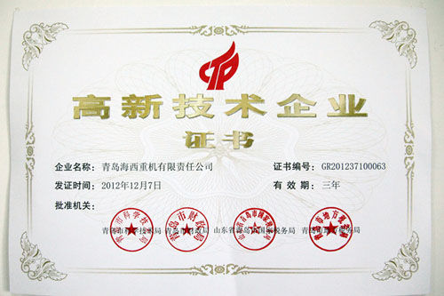 成為國家高新技術(shù)企業(yè),不僅是對公司技術(shù)水平和產(chǎn)品技術(shù)含量一個高標準的定性,而且是海西重機發(fā)展歷史上的里程碑,標志著青島海西重機從“海西制造”邁向了“海西創(chuàng)造”之路!